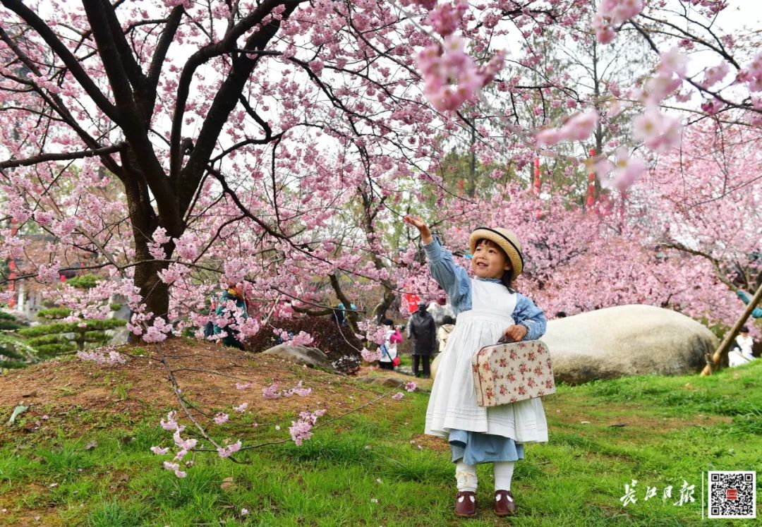 3月3日,东湖樱花园开园,一位小朋友在盛开的早樱树下拍照留影。记者李永刚 摄