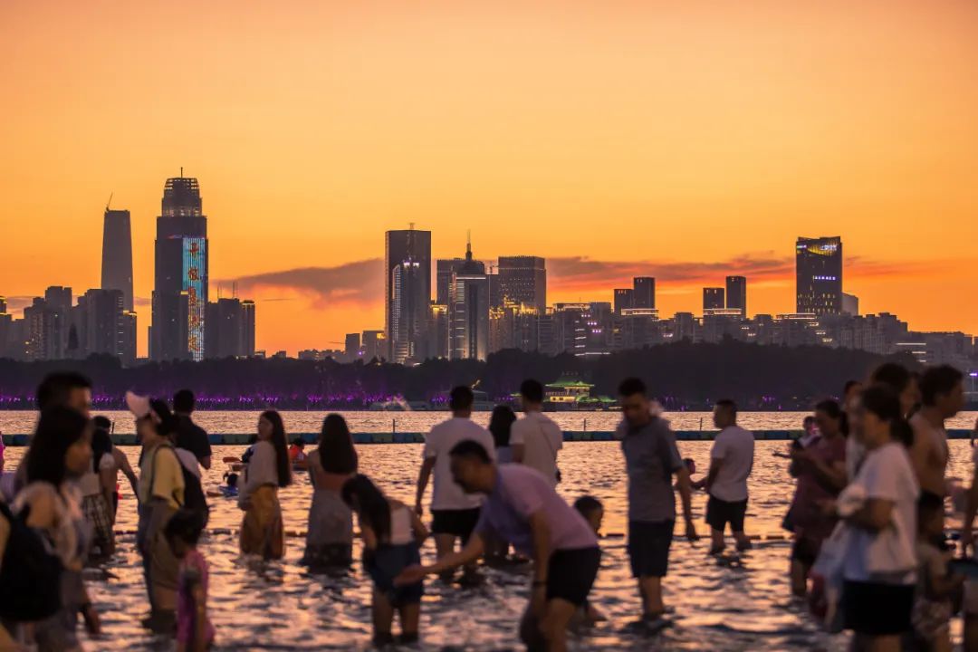 不少人来到东湖沙滩浴场看日落(资料图)。