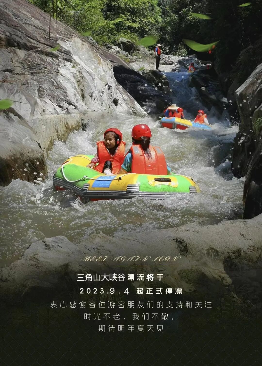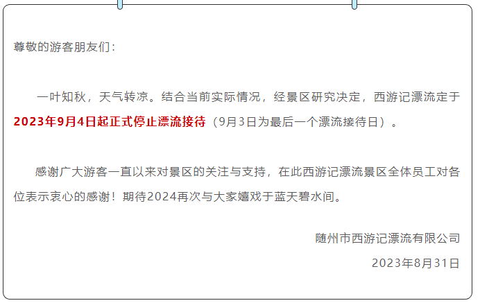 西游记漂流定于2023年9月4日起正式停止漂流接待。