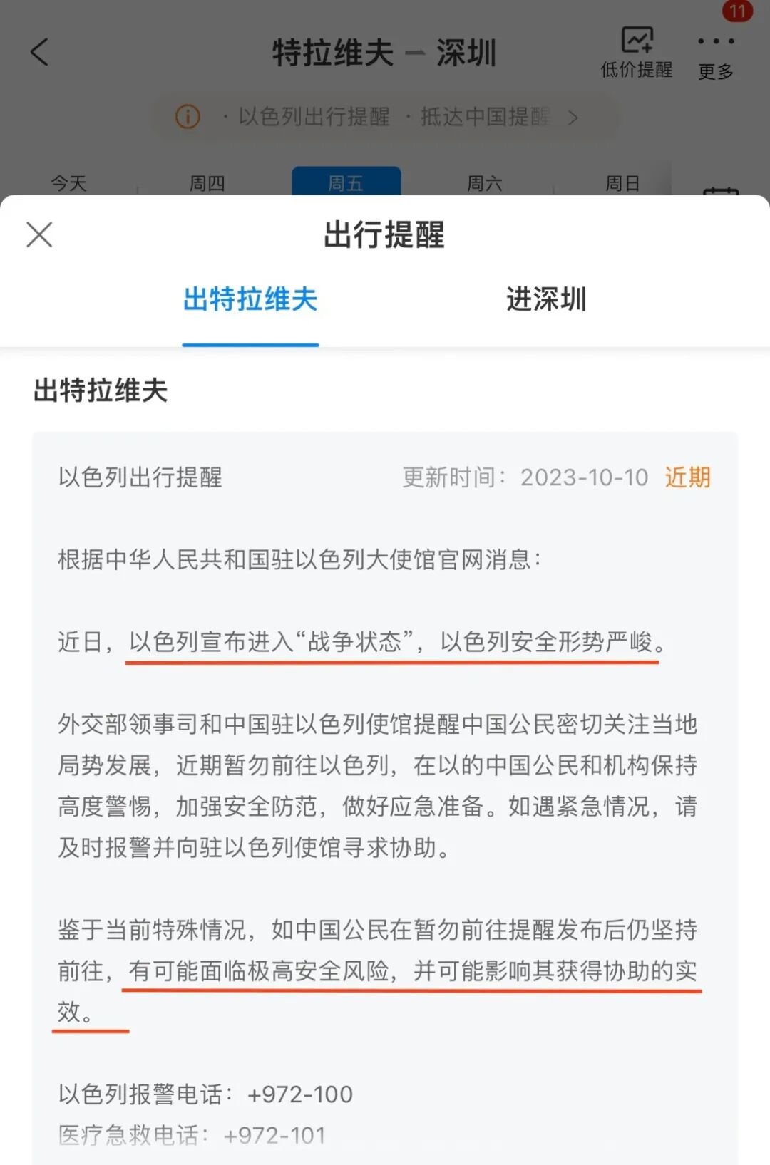 此外,中国驻以色列使馆收集整理的交通信息还显示,目前仅海南航空开通直飞中国内地航班,根据其最新发布的公告,10月12至31日期间,海南航空将正常执行每周二、周五的深圳往返特拉维夫直飞航班,暂停北京、上海往返特拉维夫航班。近日,以色列同巴勒斯坦加沙地带武装组织冲突持续升级,以色列宣布进入“战争状态”,以色列、巴勒斯坦安全形势严峻。对此,外交部领事司和中国驻巴勒斯坦办事处提醒中国公民密切关注当地局势发展,近期暂勿前往巴勒斯坦。外交部领事司和中国驻以色列使馆提醒中国公民密切关注当地局势发展,近期暂勿前往以色列。外交部门提醒